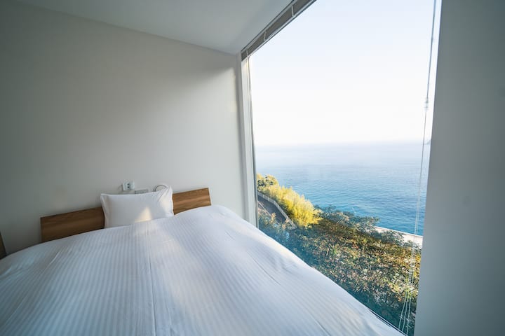 お部屋のインテリアは白ベースに統一し、全面ガラス張りで相模湾が一望できる絶景のオーシャンビューをお楽しみください!