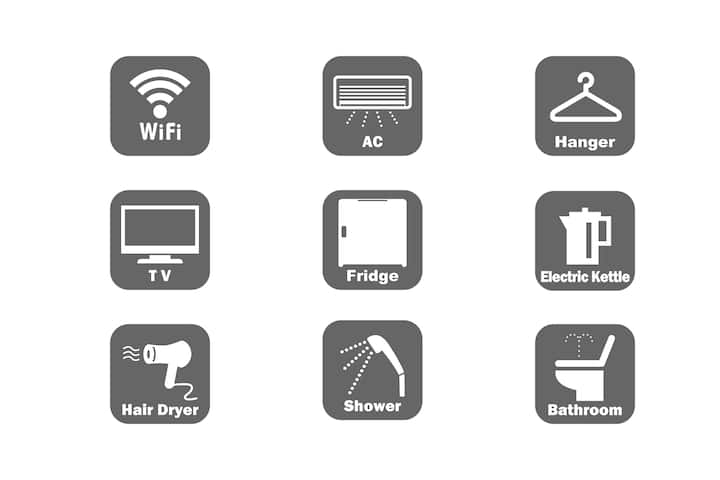 全ての部屋でWiFiを無料で提供しており、プライベートバスルーム、冷蔵庫、テレビも常備しています。また、一部の部屋では上記アメニティに加え、ユニット内にキッチンと洗濯機も備え付けられています。