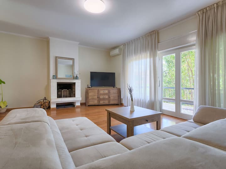 2階建ての5部屋の家、210平方メートル。上品な家具:リビングルーム40平方メートル、オープンハースの暖炉(装飾用のみ)、衛星テレビ(薄型)、エアコン。テラスへの出口。フレンチベッド1台(160 cm、長さ200 cm)のある部屋1室。テラスへの出口。エアコン付きダイニングルーム。テラスへの出口。