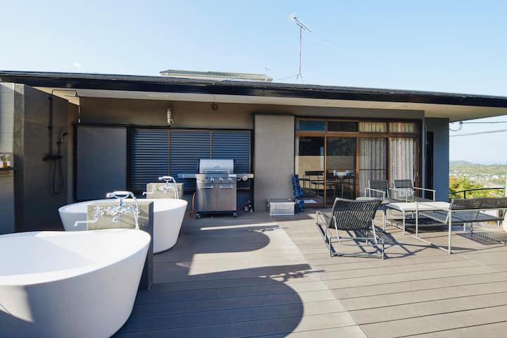 高台から望む空と山 | 天然温泉露天・サウナ・BBQ・本格キッチン、駐車場付 | マイグレフラット
