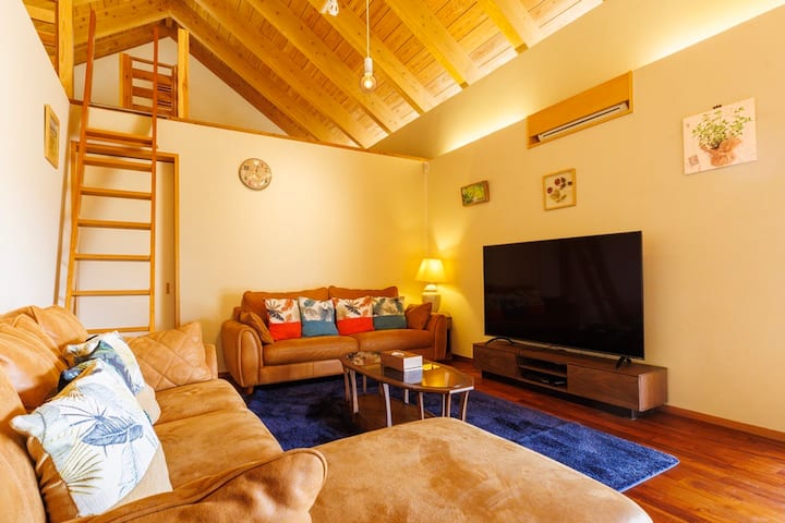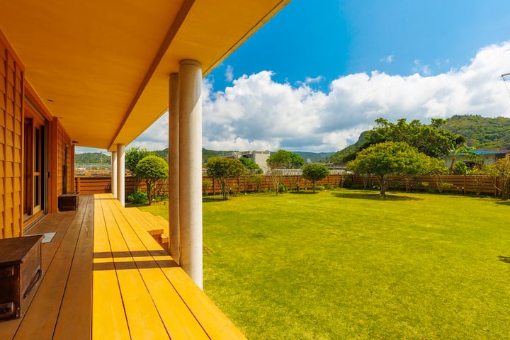 ロフト付き!約500平方メートルの庭にはゆっくりとした天然の芝生が広がっています!広々縁側から沖縄の風を感じる奥間邸!