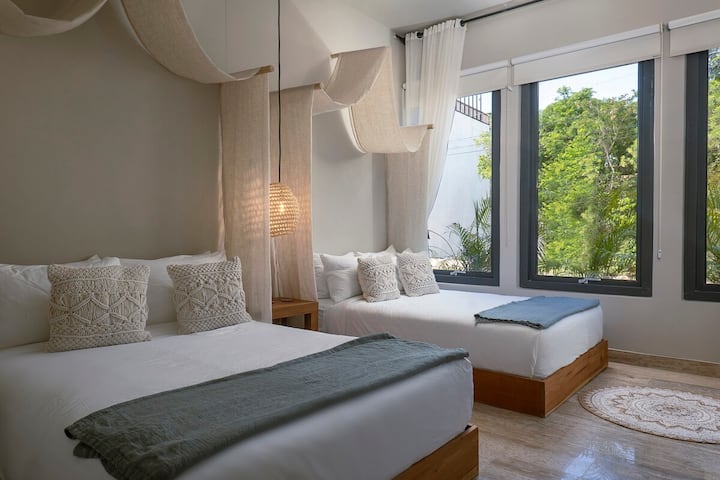 寝室6 [ Luna ] -クイーンベッド2台、テレビ、エアコン、天井ファン、クローゼット、金庫、フルサイズミラー、黒いカーテンとクローゼット(フルバスルーム付き)