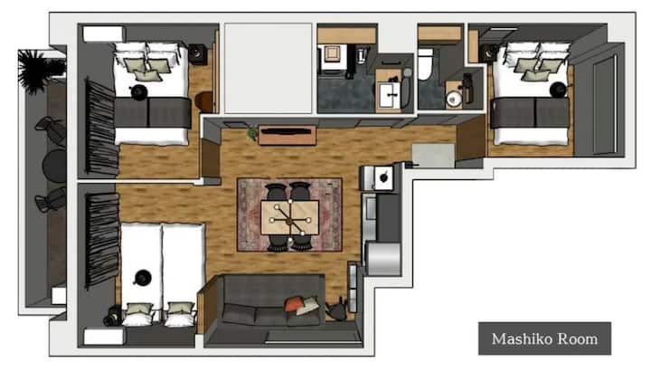 お部屋は3LDK8名宿泊可。ダブルのお部屋が2部屋、シングルベッド2台のお部屋,