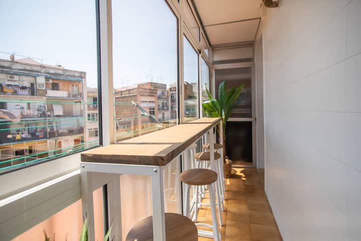 Avenida Paral·lelにある快適な4人用アパート。寝室3室(内庭を見下ろすバルコニー付きのダブルベッド1室とシングルベッド2室)、シャワー付きバスルーム、設備の整った独立したキッチンがあります。すべての寝室とリビングルームにはスプリットエアコンが備わっています。共有Wi-Fiが利用できます。