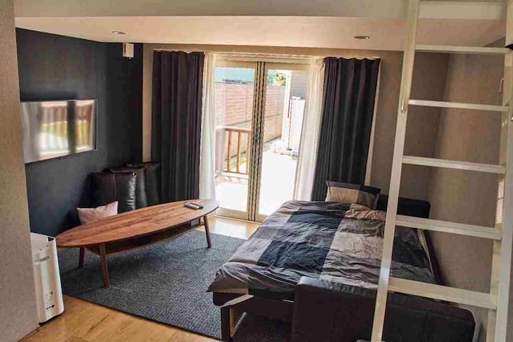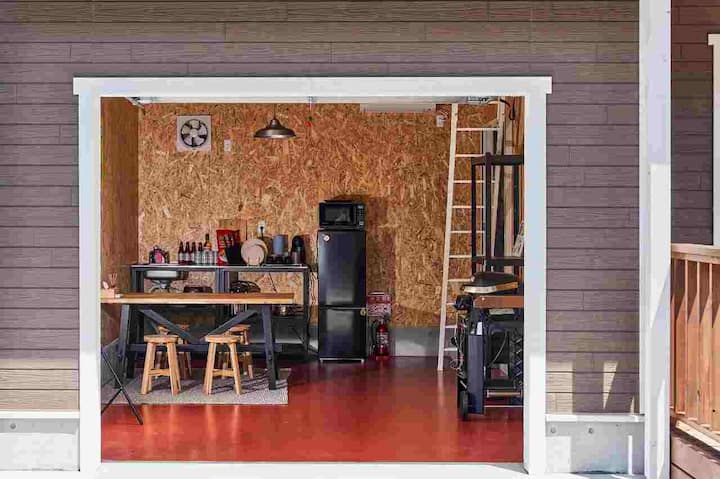 独立した宿泊4棟は2023年に完成した新築で、ガレージ一体型のコテージ風です。オーバースライダーという天井収納型のシャッターを開ければ、普段の生活とは一味も二味も異なる非日常が広がります。