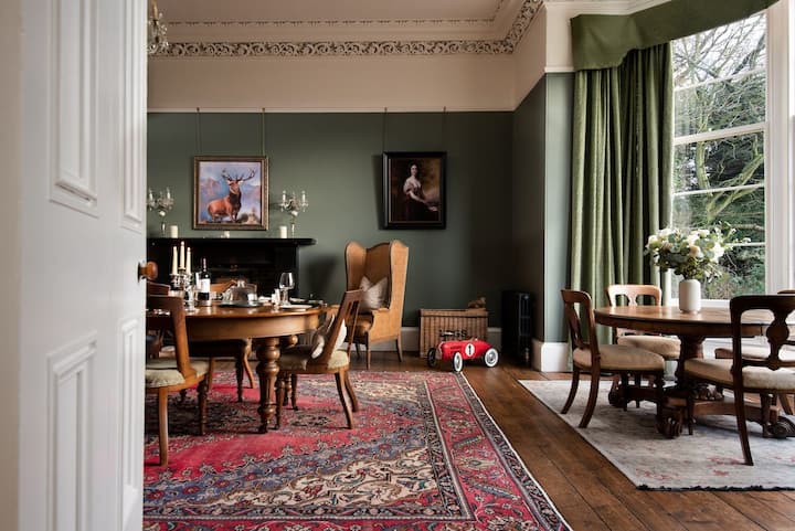 ラビ・バーンズを迎えたことがあると噂されているケアンサイド・ハウスは、ジョージア朝の典型的な大きなアーチ型の廊下、複雑なコーニス、高いサッシ窓が田舎の雰囲気と調和しています。大家族や友人グループに最適なこの邸宅は、多くの時代の特徴とスタイルを引き出すために、繊細に改装されています。