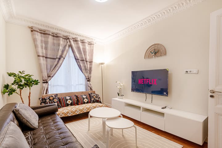 リビングルーム:きれいでモダンで洗練された装飾の、とても明るい美しいリビングルーム。快適なソファーベッドとテーブル(4名用)を備えたテレビコーナーでは、まるで自宅のようにくつろぐことができます。また、テレビにはNetflixとPrime Videoを備えたコネクテッドボックスも組み込まれています。