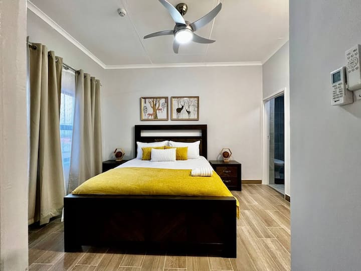 おしゃれで落ち着いたバスルーム付きのスタンダードな寝室で、リラックスできるように完璧にデザインされています。