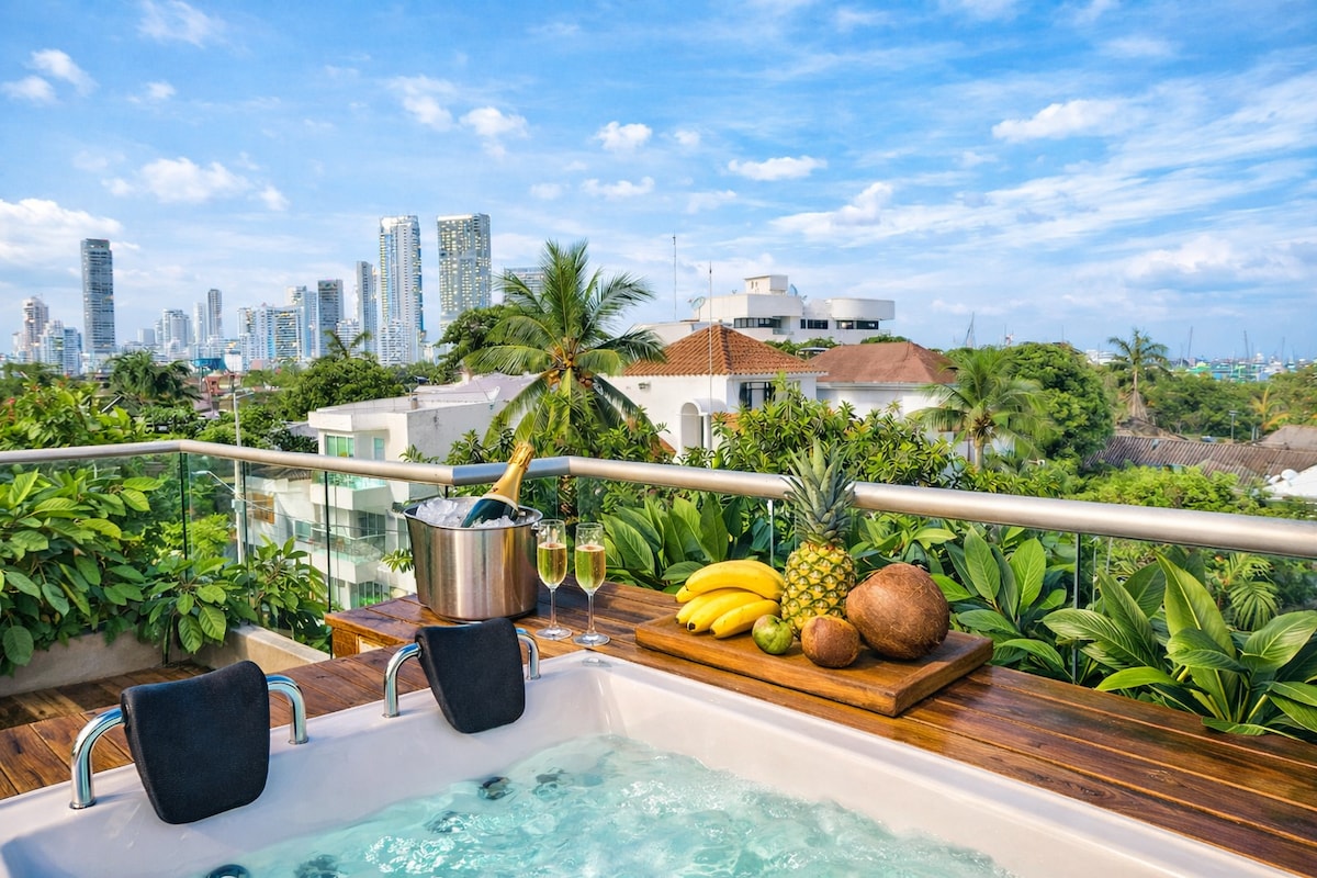 こちらのユニークな宿泊先には、独自のスタイルがあります。ユニークなカルタヘナ体験をお探しでしたら、ここはぴったりの宿泊先です。 このコンドミニアムは、旧市街の近くでビーチまで徒歩ですぐの、新進気鋭でとても中心的なエリアのマルベーリャにあります。ここでは、海と海岸線の素晴らしい景色を楽しむことができます。専用バスルーム付きのマスターベッドルームが2部屋あり、どちらにもキングサイズベッドが備わっています。 オープンキッチン、リビングルーム、ダイニングルームエリア。アパートは高層階の2階建てのコンドミニアムです。