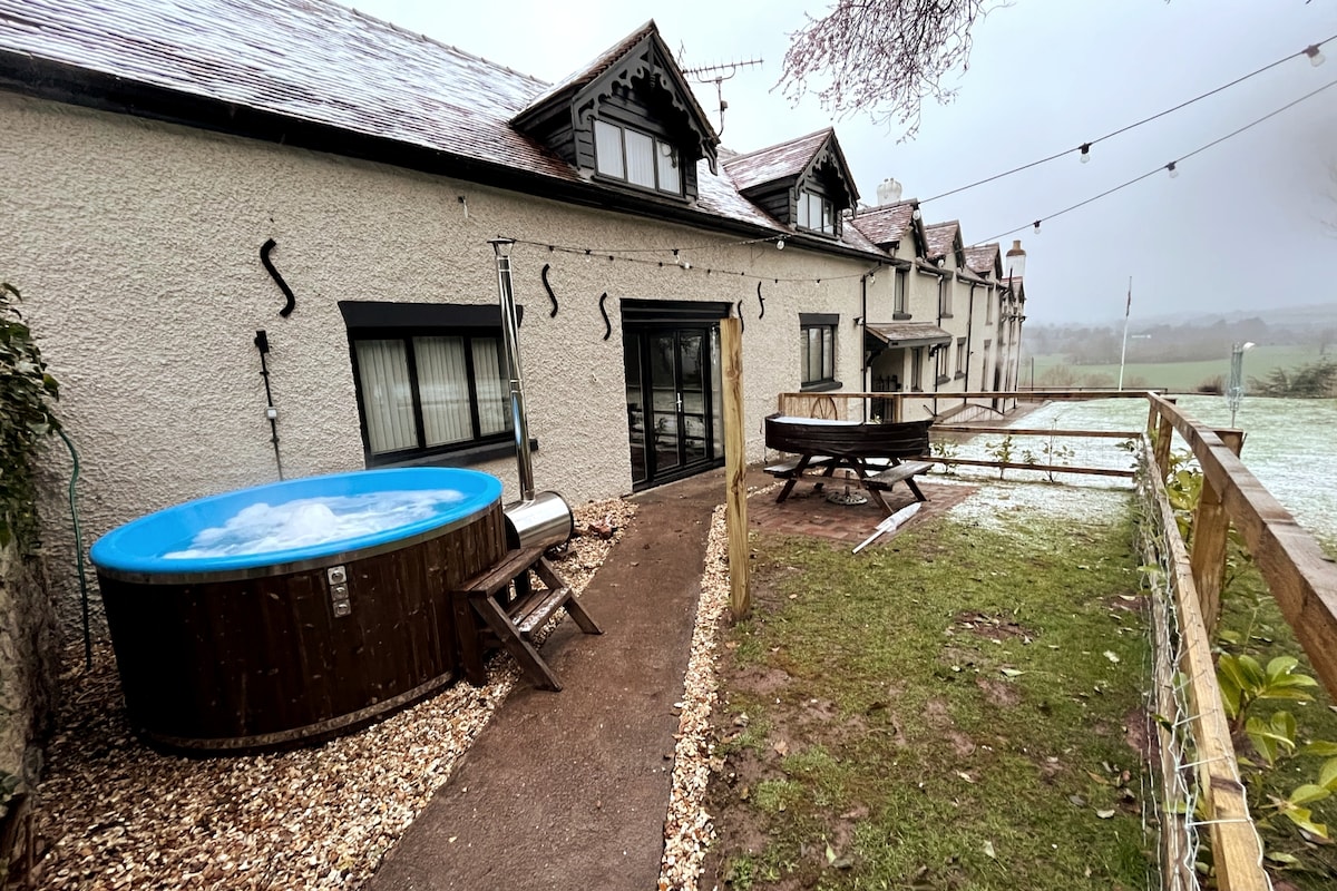 モンマスの丘の上にある、静かなワイバレーの小さな村にある自炊コテージ。6エーカーの森と隠れた庭園に建つ。 快適なキング( 60インチ)とシングルベッドを備えた大きなベッドルーム、ログバーナー付きラウンジ、テレビとWi - Fi。 サウナ、シャワー、ジャグジー、小さなトイレ付きの素晴らしい大型スパルーム。インダクションホブ、グリル、ファンオーブン、電子レンジ、洗濯機、タンブルドライヤー、冷蔵庫、トイレ付きの独立したバスルームを備えたキッチン。
