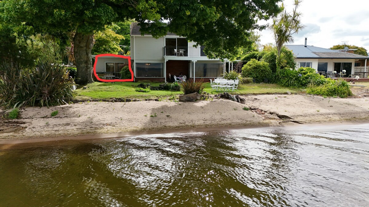 Lake Tarawera, spa, lawn to lake jetty & boatshed