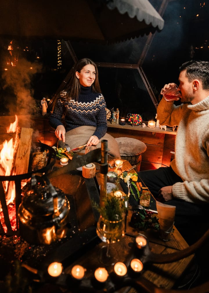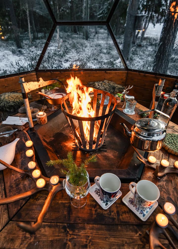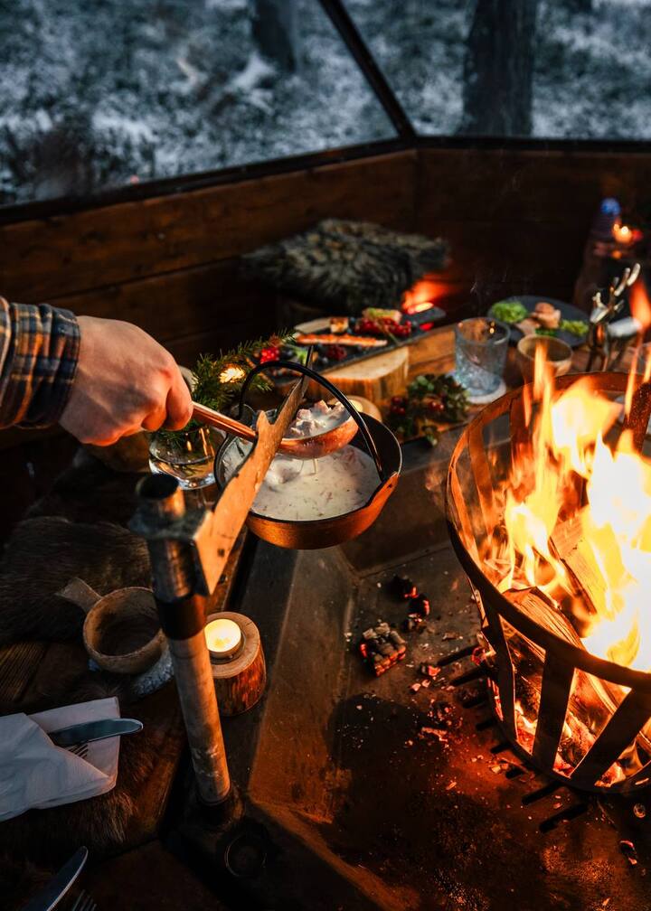 ラップランドの小屋でたき火を囲んで伝統的なディナーを楽しもう