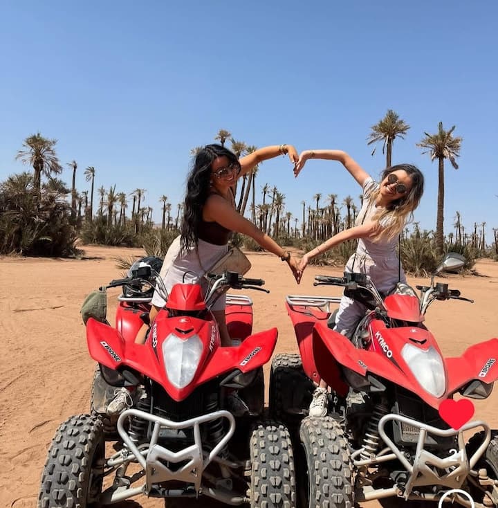 砂漠で四輪バギーに乗って温水プールを楽しみ、モロッコ料理のディナーショーを堪能