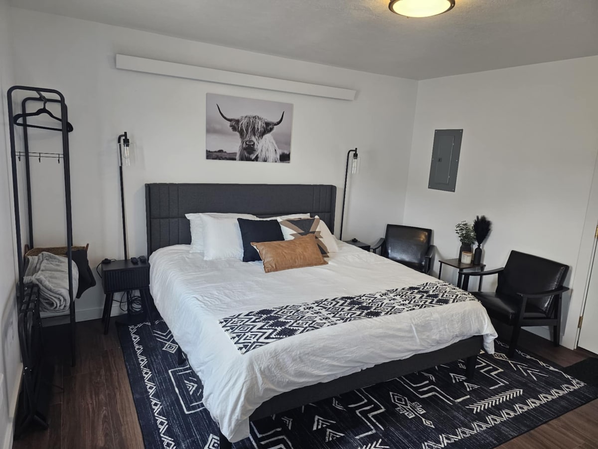 快適でスタイリッシュなリトリート|完全に改装済み|キングサイズベッド1台 ご自宅のような宿泊先へようこそ!この完全に改装され、考え抜かれたデザインのお部屋には、快適なクイーンベッドが2台あり、家族連れやカップル、一緒に旅行するお友達に最適です。 豪華な寝具付きのキングサイズベッド1台で、快眠をお楽しみください スマートテレビとストリーミングオプションを備えたオープンコンセプトのリビングエリア すべての設備が整ったキッチン 調理に必要なものがすべて揃っています 無料のコーヒーと紅茶 ADA非準拠 清潔なタオルと洗面用品 提供済み