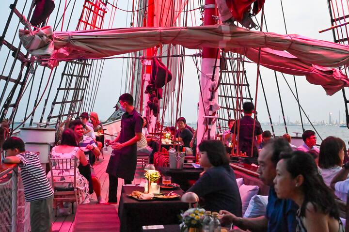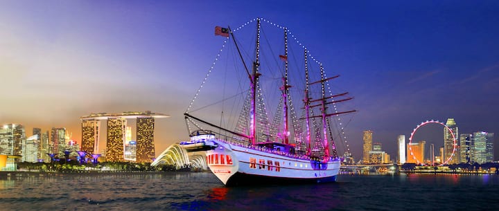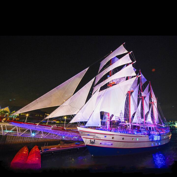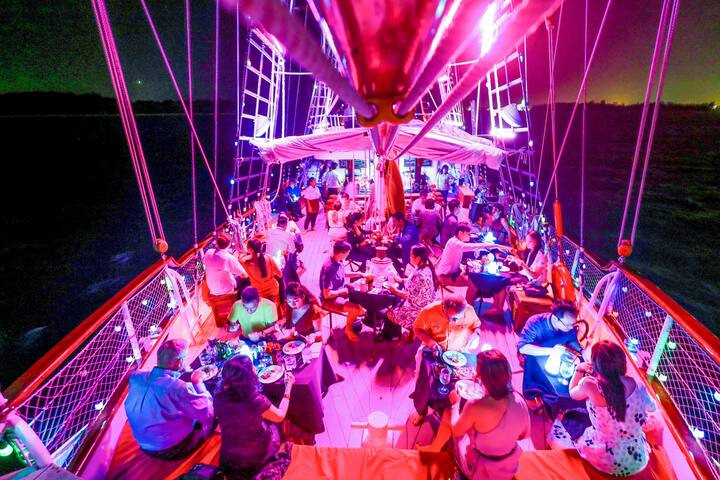 豪華な大型帆船で星空の下、食事とセーリングを楽しもう