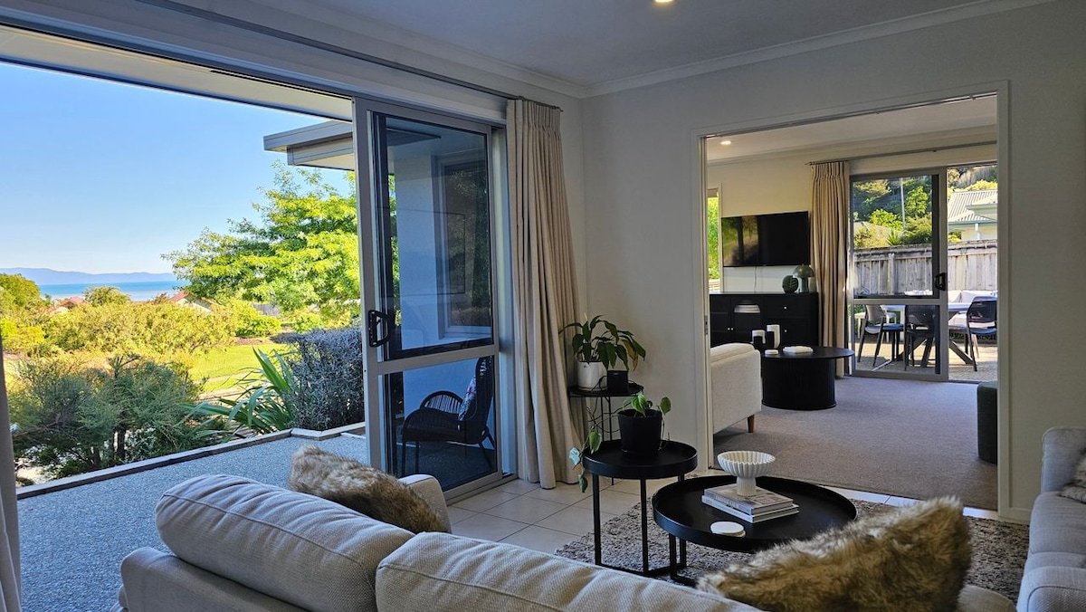 Gorgeous views and bird song, with complimentary breakfast cereals tea/ coffee. Beautiful, fully refurbished private studio, attached to larger home. Own entrance, deck, ensuite, kitchenette-not full kitchen. Overlooking Tasman Bay, Nelson Haven, Boulder Bank, Mountains of the Abel Tasman National Park and Garden - Home to native birds eg Tui and Piwakawaka. Tranquil base to relax and explore the region. 400m from the coastal walking/cycle trail. City 5 min drive, 40 min walk, 15 min bike ride.