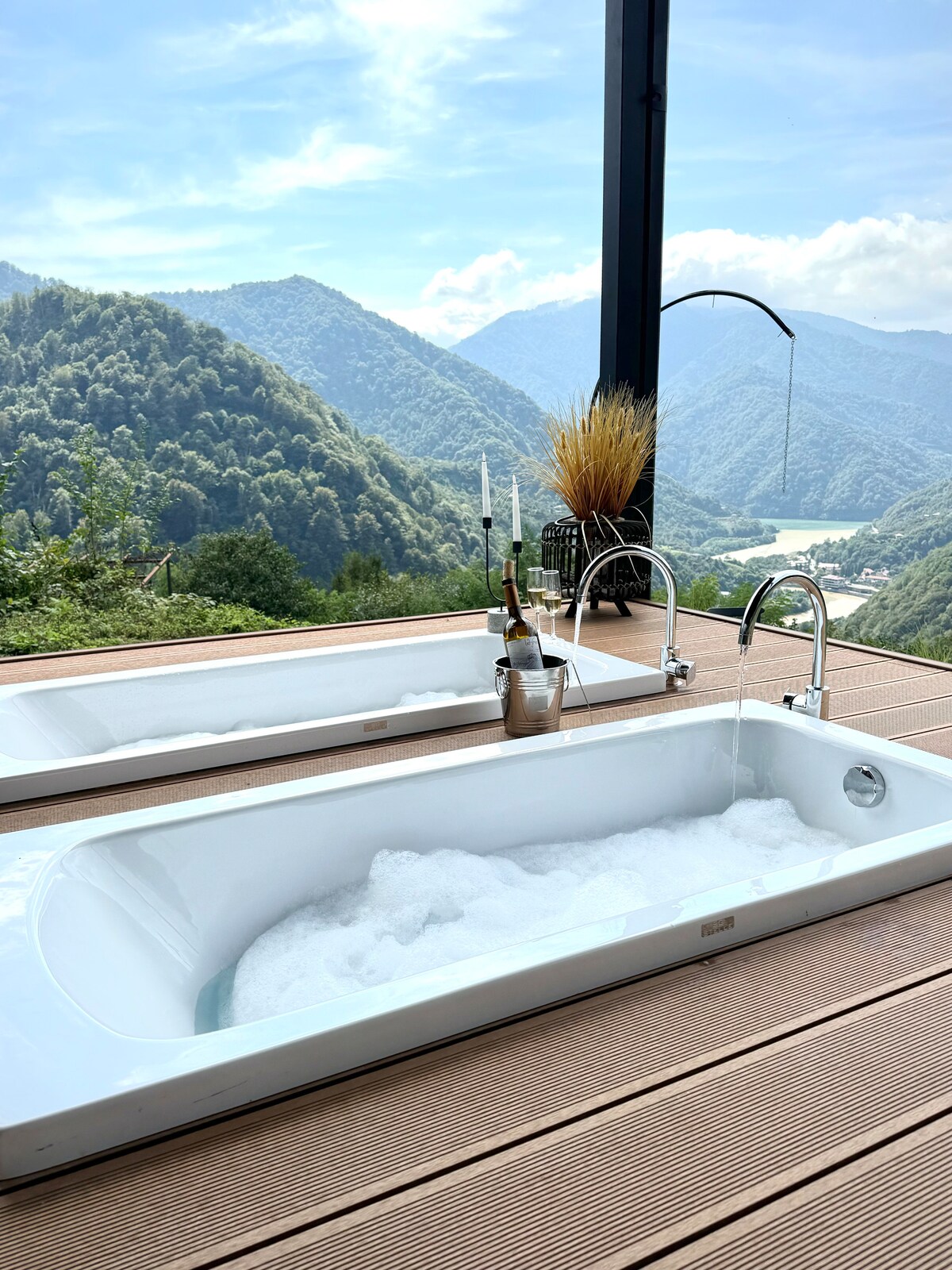 The price includes a visit to the amusement park costing 160 lari ($60) for two. Kick back and relax in this calm, stylish space with unique panoramic bedrooms and jacuzzi. Our complex consists of cottages and a park with unique locations, such as the world's largest bed-mattress in the shape of Adjarian khachapuri, as well as the largest 9-meter wine horn in the world, huge bird nest, glass cottage, relaxation areas, and much more.