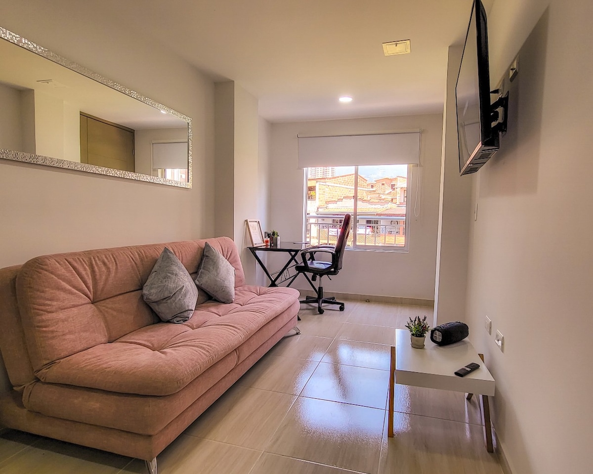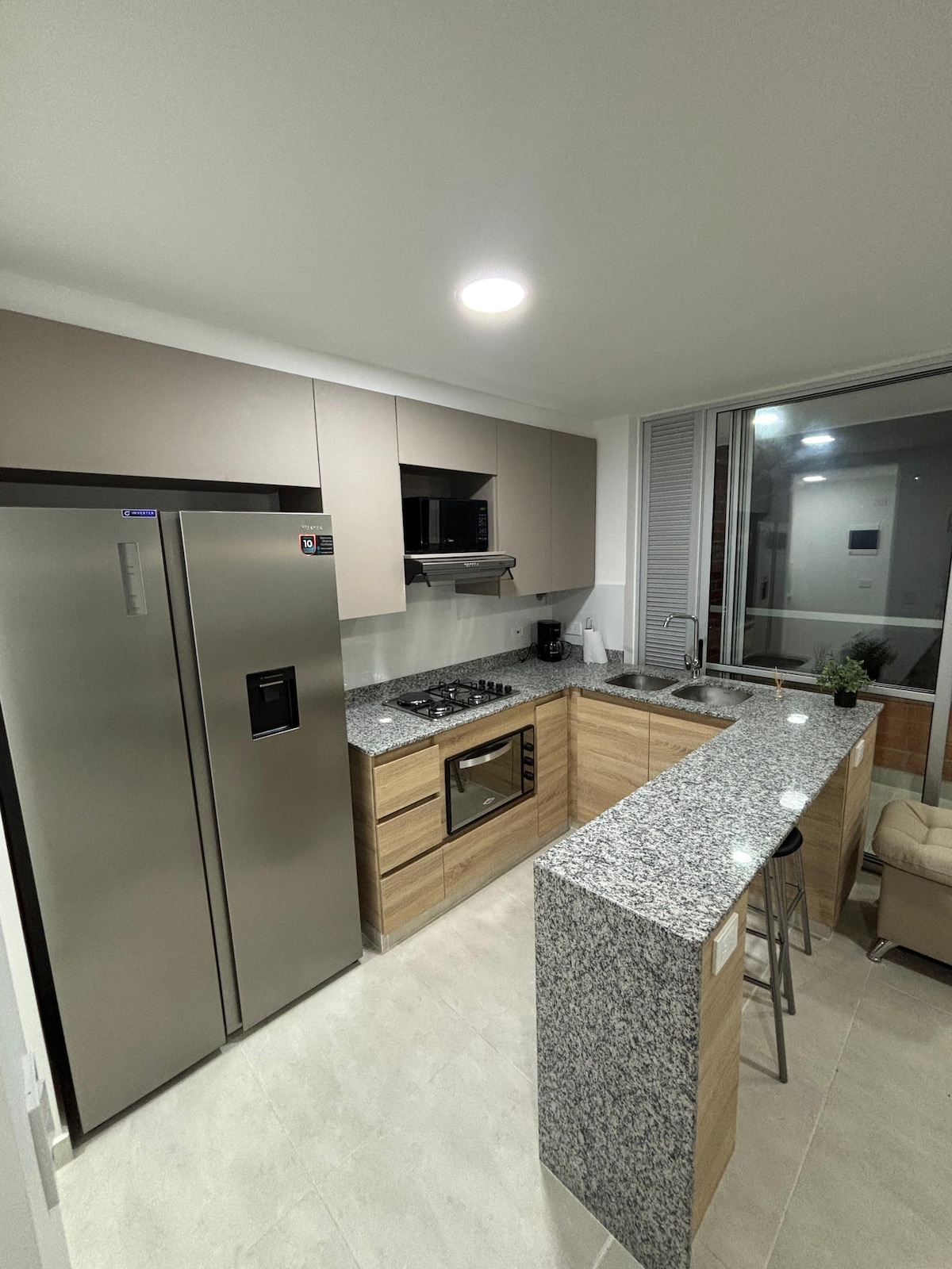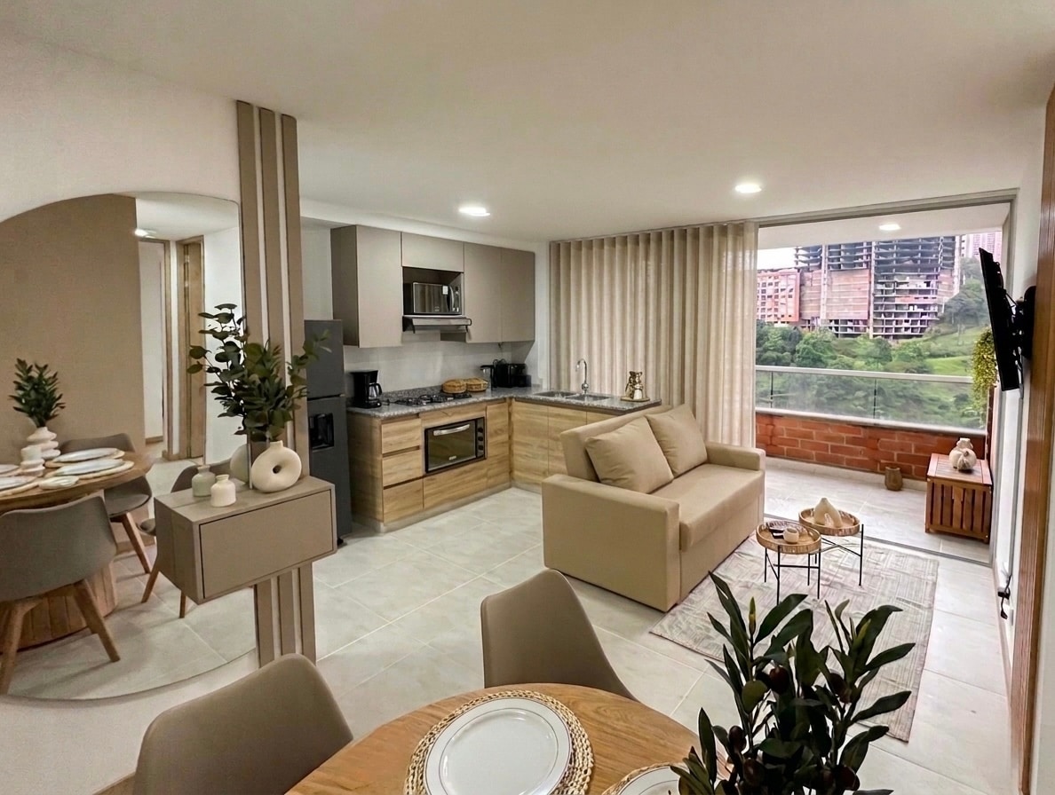 Apto minimalista en el piso 16. Diseño despejado de concepto abierto, ideal para estancias ejecutivas o viajes prácticos. • Espacio: Barra integrada (sin comedor), sofá reclinable y capacidad para 4 (2 camas dobles). • Comodidad: AC en alcoba principal, cocina dotada, lavadora y WiFi veloz. • Ubicación: Junto a CC Mayorca y a 13 min del Metro. Disfruta de amplitud, silencio por altura y ubicación estratégica. Seguridad 24/7 y registro vía Hospy.