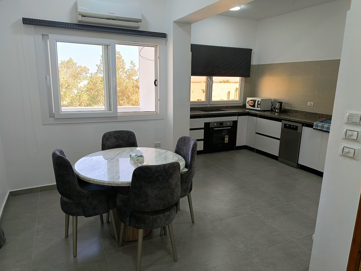 ダイニングエリア、設備の整ったキッチン、紅海の素晴らしい景色を楽しめる専用バルコニーを備えたこの2ベッドルームのアパートで、エジプト風の家具を体験してください。寝室、リビングルーム、キッチン、バスルーム、海を望むフロントの外のプライベートテラスなど、アパートでのプライバシーをお楽しみください。共有エリアは階段のみですが、ご自由に出入りしていただけます。