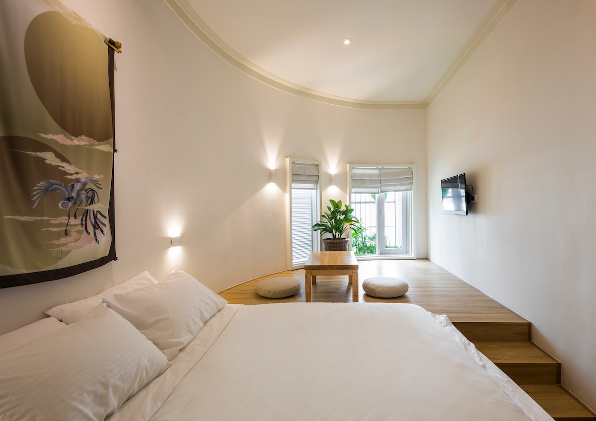 Fall in love with our Japanese-inspired studio in downtown Saigon! The stunning space features exposed columns, curved walls and a unique glass ceiling that fills the hallway with sunlight. Relax at the small garden and coffee lounge at the back . The unit is equipped with a luxurious bed, full kitchen, Netflix, toilet with bidet, and bath essentials—all the ingredients for a perfect stay ;)
