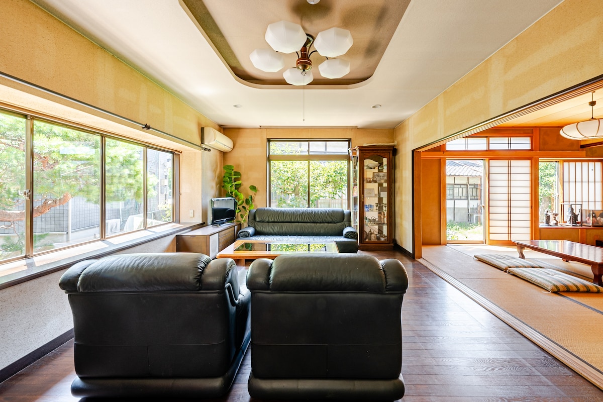 広島駅から電車と徒歩で19分!200年の歴史がある広大な日本庭園と本格和室のある閑静な一戸建てをまるごと貸し出します。希望者には日本の着物の着付け無料サービスがあり、着物を着て伝統的な日本茶の儀式も体験できます。庭に桜があり、3月終わりから4月初めはきれいです。ツツジは5月頭に満開です。広いリビングから庭園が見渡せます。 広島駅までJR山陽線13分の安芸中野駅の近くです。安芸中野駅から宿まで徒歩6分です。新幹線や空港からの連絡バスにスムースに乗れます。当到後に荷物を置くことも可能です。 駅に近いですので、平和公園へ行きやすく、宮島へは直通JRで45分です。この宿を起点に呉、大久野島、尾道、倉敷、鞆の浦を訪れることができます。2台停めれる無料駐車場もあります。 ホストは横の家におり備品の追加や買い物をサポートします。徒歩1分でコンビニエンスストアのローソンがあります。 家族全員がのびのび楽しめる広大な宿泊先です。お子様用のおもちゃがたくさんあり、飽きずに泊まれます。ご家族、ご友人でゆっくりお過ごしください。 ※自然が近いため、春から秋は宿の外に虫が出ます。苦手な方は遠慮ください。