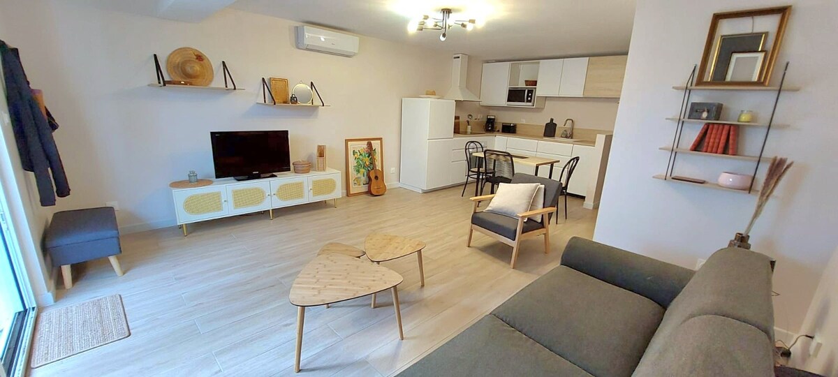 サン・エイユルフの住宅街にある小さな楽園。32平方メートルの敷地内にあり、独立したアクセスがあります。海と商店は700m、木々の生い茂る庭、テラス、エアコン、プールアクセス、Wi-Fi、家庭用リネン(シーツ、タオル、ティータオル、プールタオル)、バーベキュー。駐車場。料金は大人2名様分です。