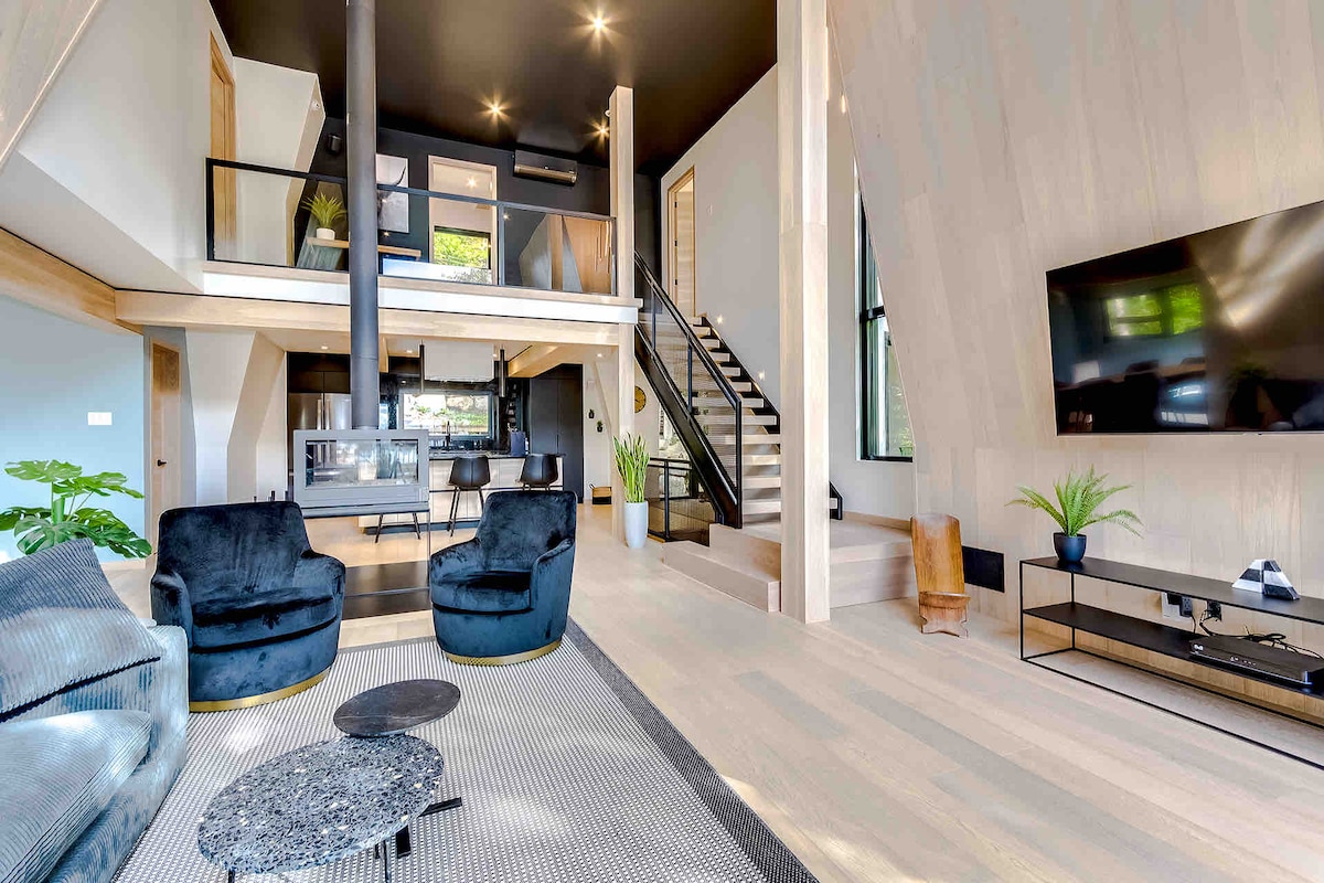 For your vacations choose the Chalet Horizon, an Eden in nature with a view of the mountains ♥ You will appreciate the chalet thanks to: ✷ Semi-private beach 5 minutes away ✷ Large private land, totally surrounded in pure nature ✷ Large bright windows with a view of the horizon ✷ Luxurious and comfortable spaces ✷ Spa open all year round ✷ Terrace equipped with a BBQ and gas fireplace ✷ Smart TV with speakers ✷ Indoor cozy gas fireplace ✷ Foosball table ✷ Wine bar