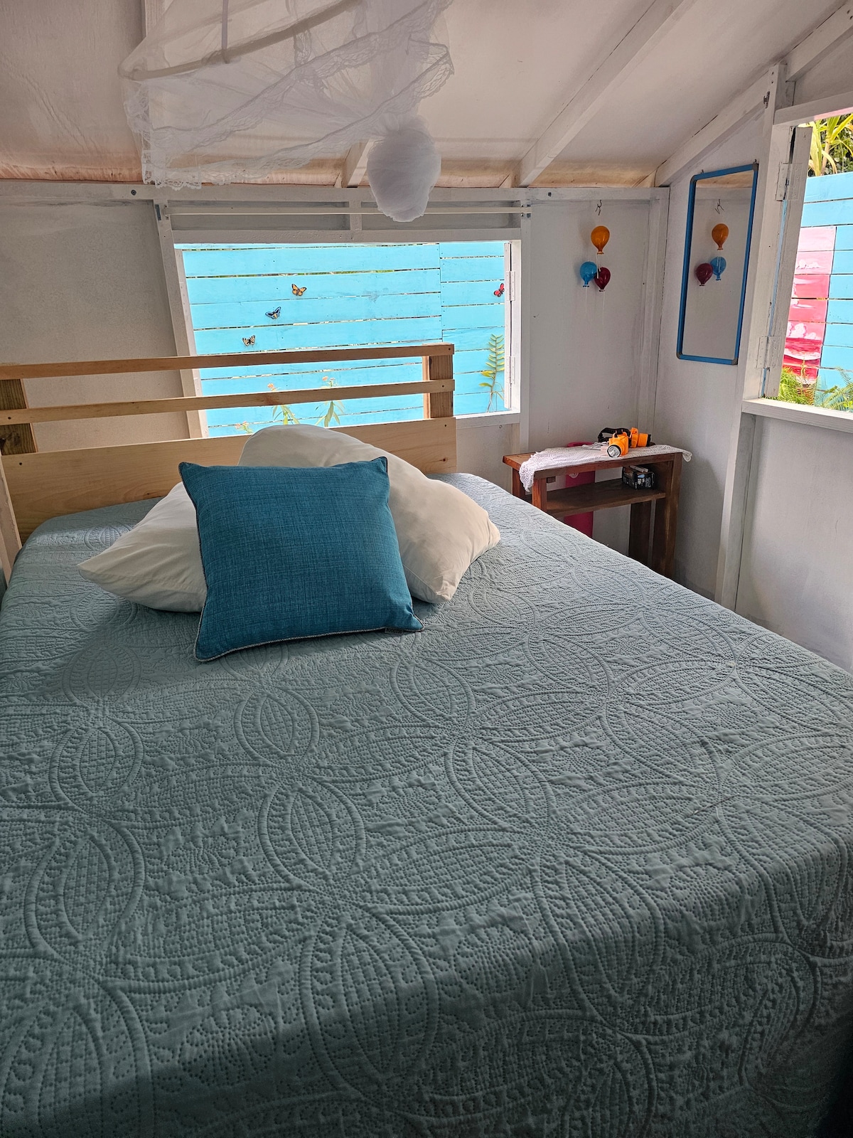 Relax in Green Serenity, a cozy, green-themed room with a comfy double bed, ensuite bathroom, private coffee station, and outdoor seating. Guests enjoy access to the shared outdoor kitchen and laundry facilities. Just minutes from the Boiling Lake trek head, this is the ideal spot for nature lovers and couples seeking tranquility. Fresh meals on site. Explore our other rooms: Blue Tranquility | Coral Haven Check out my helpful guide.