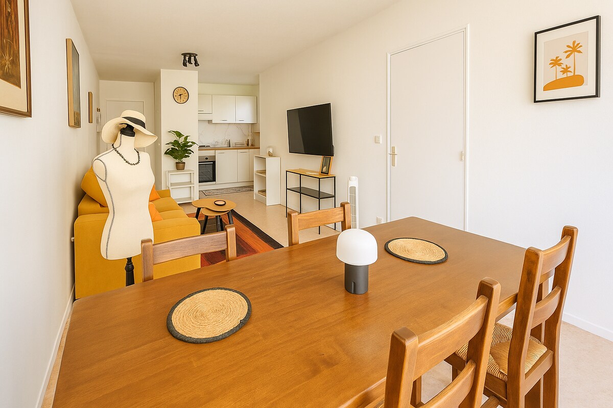 この70㎡の美しいアパートへようこそ。リラックスしたい時や仕事で滞在するのに理想的な、温かみのあるアパートです。 1階にはテラスに面した広いリビングルームがあり、設備の整ったキッチン、ダイニングエリア、ソファベッドのあるリビングルームが備わっています。 2階には、160X200のベッドとシャワールームのある大きな寝室があります。 高速道路と商業地区から3分の場所にあり、田園地帯の静けさを満喫できます。 中庭に安全な駐車場(車、バイク、自転車)