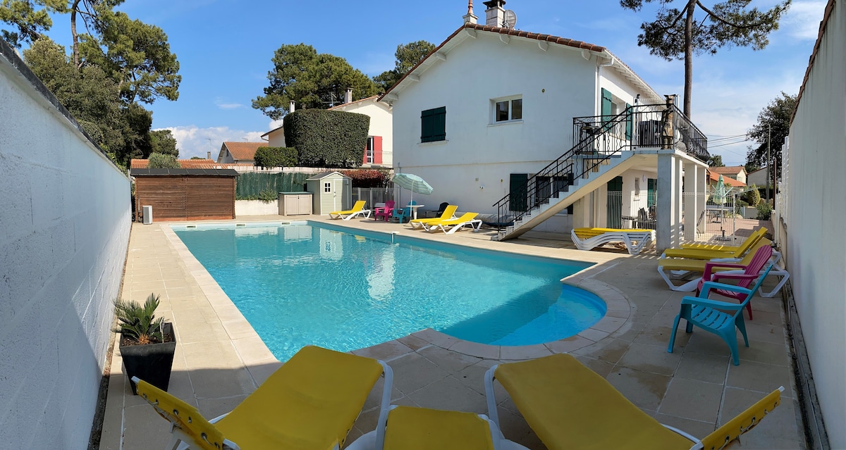 温水プール付きバスク風ヴィラ - ビーチ、アクティビティ、ショッピング街から300メートル 最大10名様まで宿泊可能:寝室4室、バスルーム3室。屋外温水プール、熱帯雨林パーゴラ付き。 内部:リビングルームには、140 cmのソファベッド1台と接続テレビが備わっています。 設備の整ったキッチン。 3つのベッドルームには160cm幅のベッドが1つ、スタジオには140cm幅のベッドが1つあります。 屋根を開けることができる温水プール。 フェンスで囲まれた子供のための安全な敷地、4台分の駐車場。