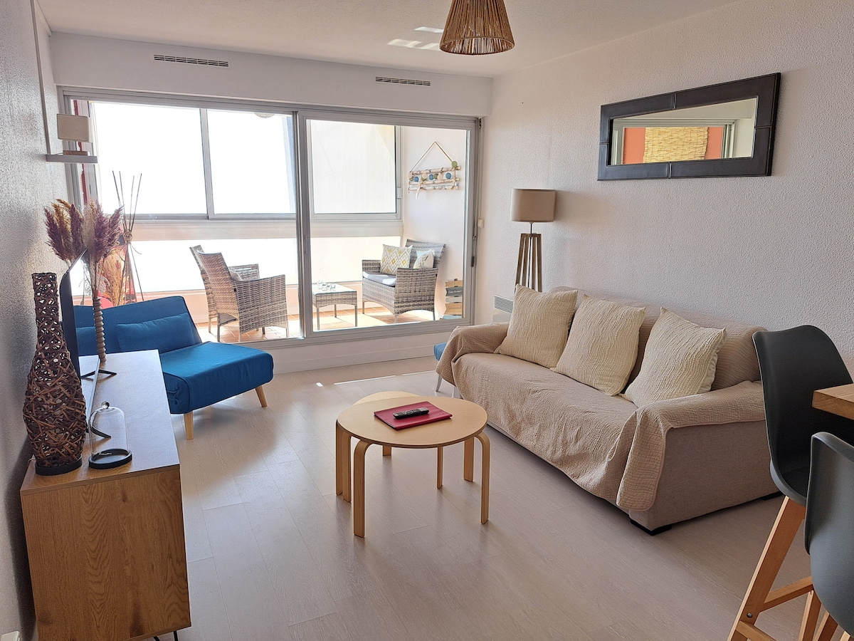 海に面したワンルームマンションで、南南西に面した広いバルコニーがあり、エレベーター付きの8階にあります。必要なものがすべて揃った設備の整ったキッチン... シャワー、タオル乾燥機、洗濯機を備えた浴室。 寝室には、ソファーを数秒で高級ベッド(140 X 190)に変えることができるシステムと、子供やティーンエイジャー用の本物のフロアマットレス(75 X 190)を選びました。 バルコニーには4名様用の小さなサロンがあります。