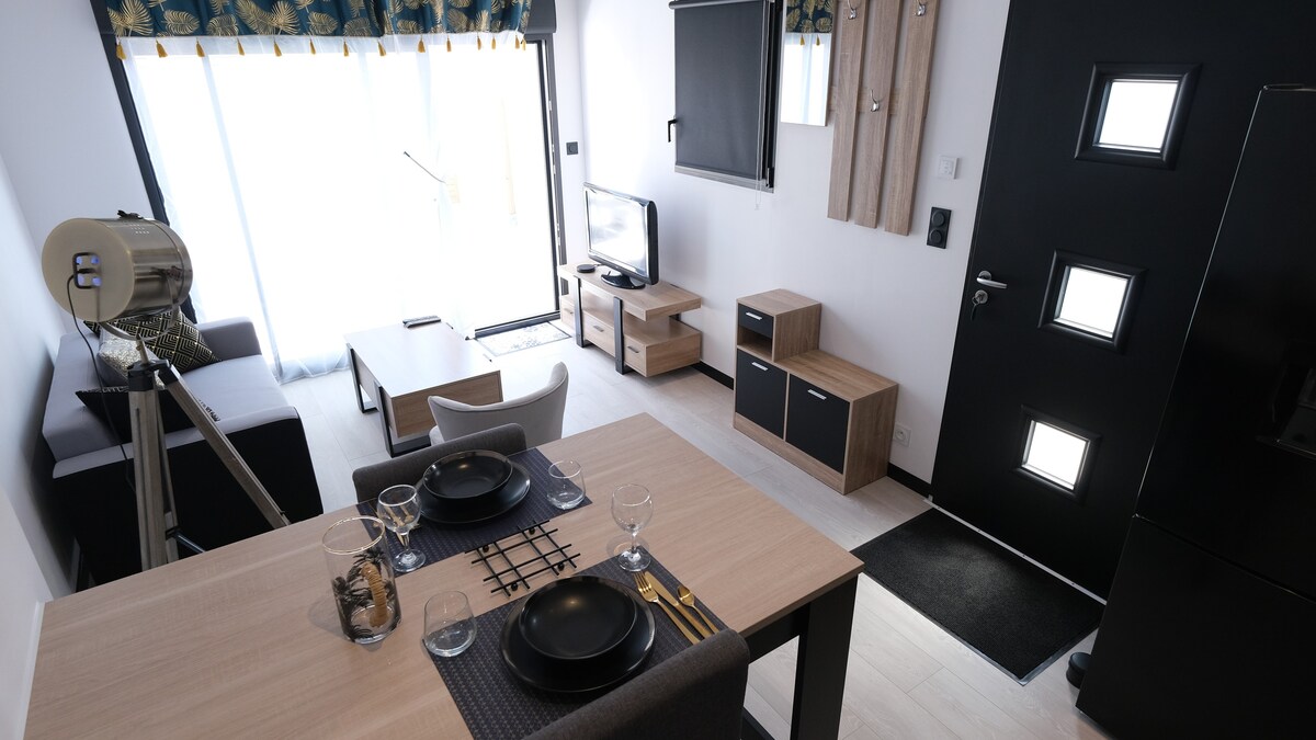 明るく美しく装飾された21m²の快適なスタジオで、海の空気をお楽しみください。設備の整ったキッチン、シャワールーム、リビングエリアが含まれています。 ガーデン家具とバーベキューグリルを備えたプライベートテラスをお楽しみください。駐車場+マウンテンバイク2台をご利用いただけます。 ラ・ダヴィエールのビーチと砂丘は宿泊施設から900mの場所にあります。 50m先にレストランがあり、一年中営業しています。 夏は1.5km先にある小さなスーパー、レ・トネルがオープンしています。 サン・ジャン・ド・モン市街地:車で5分/自転車で15分 ノートルダム・ド・モンも同様です