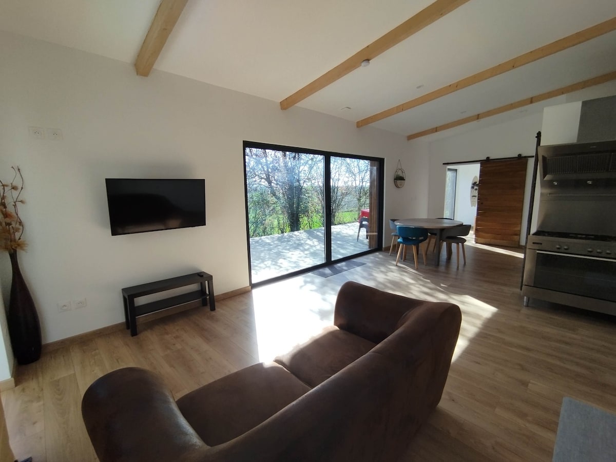 Passez un séjour au calme dans ce logement neuf. Lumineux, vue nature, grande terrasse et confortable (climatisation réversible, suite parentale avec douche double, baignoire jacuzzi, piano de cuisson, lit king size, hauteur sous plafond, larges baies vitrées , etc...) A mi chemin entre l'aéroport Lyon st Exupéry (20'), Eurexpo (20'), le centre ville de Lyon Bellecour (30'). Situé sur les hauteurs du village, l'environnement est vallonné et propice à de petites ballades entre champs et forêt.