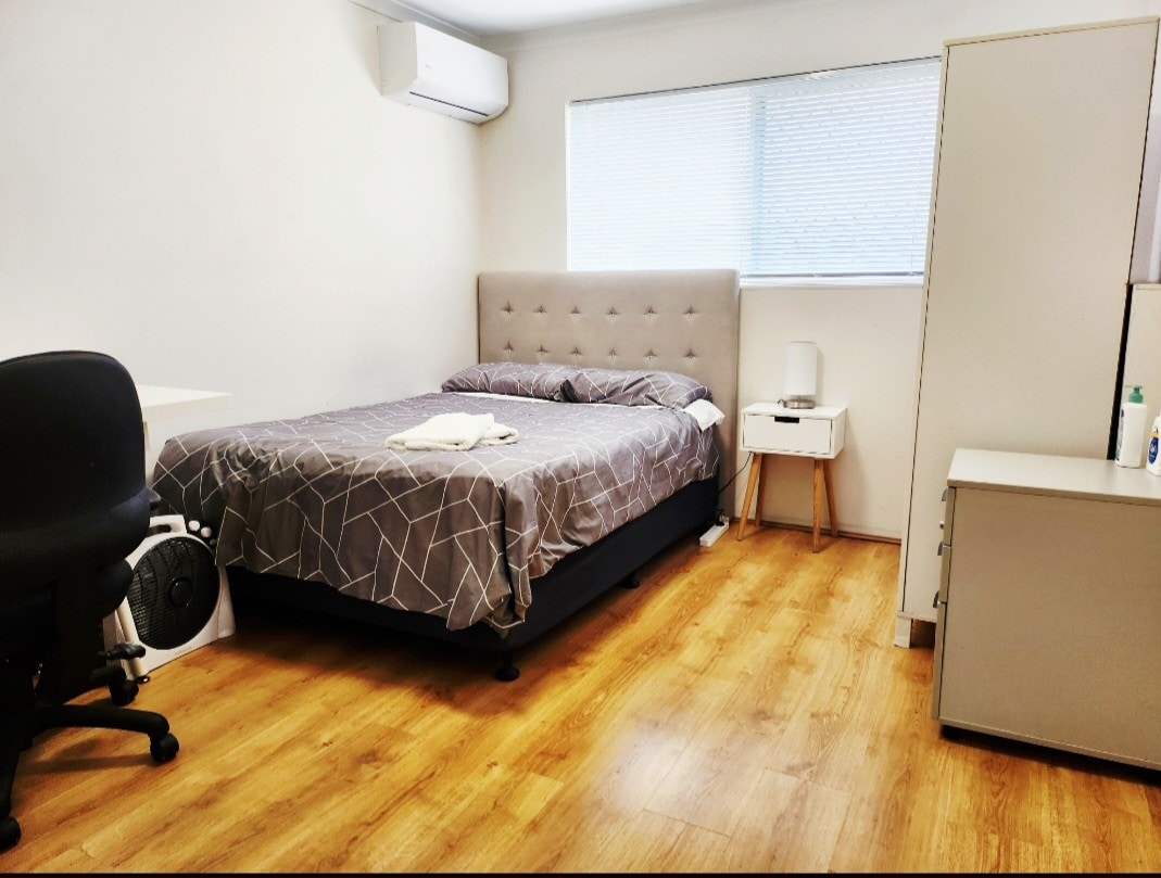 This is the private, self-contained guest suite of a large family home. Our property has a shared secure entrance from the street and the guest suite has its own entrance door, deck, travertine stone shower, separate toilet, kitchenette with mini-bar fridge and a small built-in robe. Queen-size bed, wall-mounted smart TV, reverse cycle air-con and a small BBQ on the deck. Laundry facilities available if you need. Minimum 2-night stay and 12% discount for 7 nights or more. Free street parking!