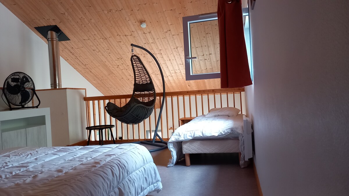 ポン・ドゥ・モーミー農場へようこそ 本物のヴィンテージの精神と温かみのある雰囲気を持つ、ポン・ドゥ・モーミーのキャビンは、エキゾチックな体験に身を任せるのに理想的な場所です。 燃やした木材の羽目板を使用して環境に配慮して建てられた、独特のスタイルはあなたを感動させることでしょう。 晴れた日には、大きなテラスと池の息をのむような眺めを、そして長い夜には、柔らかく居心地の良い雰囲気と薪ストーブをお楽しみいただけます。