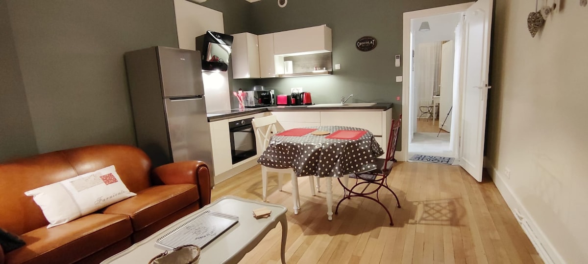 Suite au cœur de Montargis. Séjour avec cuisine équipée ( four, micro ondes, plaque induction,frigo, lave vaisselle, machine à laver, nespresso ), espace repas, Tv avec canal + chambre avec lit 160x200, Tv avec canal, literie premium, salle d'eau italienne, Wi-Fi haut débit, clim, serviettes et savons inclus. Rue calme, parking gratuit ou privé ( option ), arrivée autonome avec serrure connectée. Service en option : petit déjeuner, borne électrique