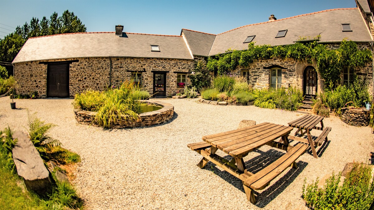 中庭を囲むように建てられた17世紀の石造りのコテージを美しく改装しました。 田舎の散歩やサイクリングができる、静かな田舎の環境。湖の砂浜、ショップ、レストランから15分の場所にあります。地元で楽しめることがたくさんあり、ブルターニュを探索するのに理想的な拠点です。 Noisetteには、イタリア製シャワーを備えた広いバスルーム、4つの寝室など、移動がしにくい方にもアクセスしやすい設備があります。専用のフェンス付きの庭。共有庭園 - 3人と5人のゲスト用の小屋、子供の遊び場(スカイフォート、ブランコ)