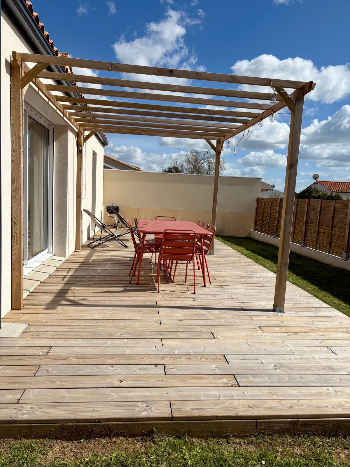 居心地の良いモダンな木造住宅、薪ストーブ、中央に広々とした快適なキッチンアイランド。 4名+乳幼児1名、リビングルームのソファベッドで2名様の追加宿泊可能(要リクエスト)。 ご到着時にはベッドが整えられており、タオルもご用意しております。 屋根付き。隣接する住宅はありません。ビーチから1,700m、商店街から600m。禁煙宿泊施設 敷地は柵で囲まれています。 サイクリングコース、クレマンソー、競馬場、タルモン・ゴルフ、ヴェイヨン、ポワント・ペレ。