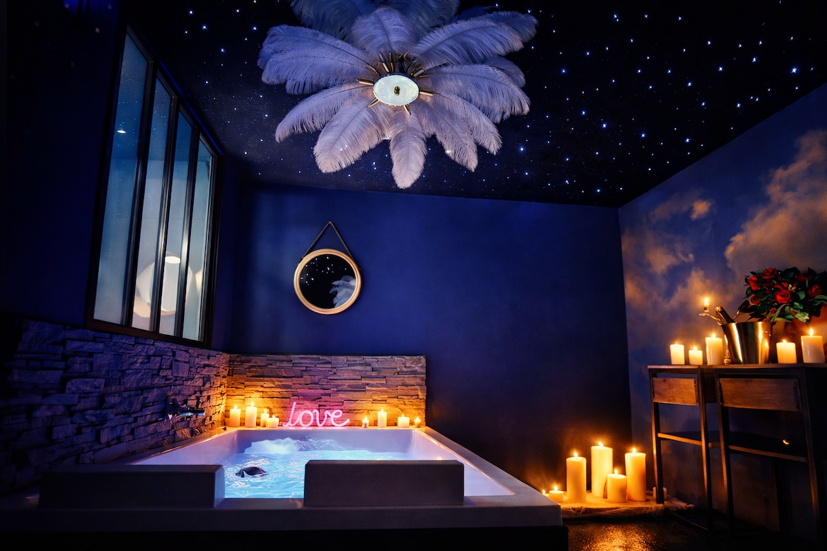 スパ、暖炉、テラスを備えたロマンティックなラブルーム