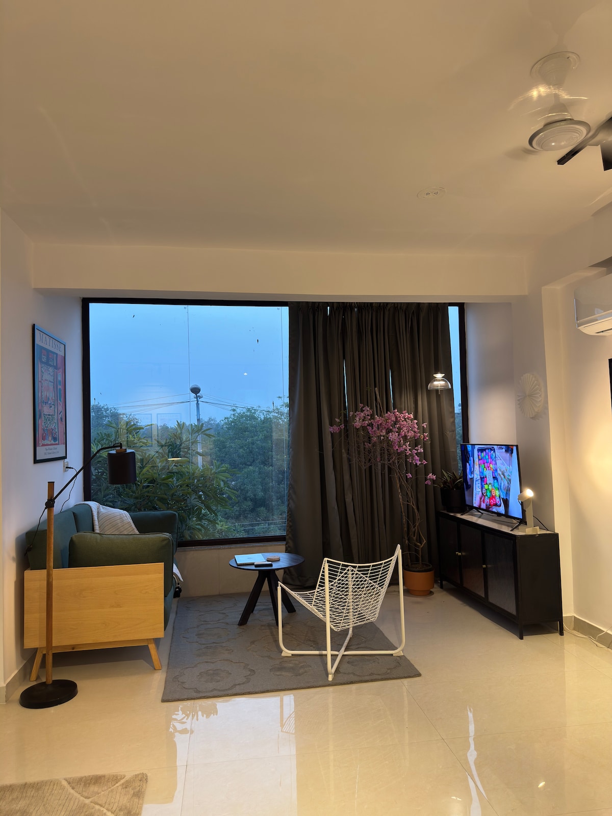 Eviva is a studio apartment on the first floor, in F Block, Saket. It has a bedroom with large windows flooding the space with natural light, a well-fitted bathroom and a kitchen with all the essentials you need for a short stay. The spacious king-size bed with an 8 inch mattress ensures a comfortable night's sleep. We've also fitted the place with a 50-inch smart TV. Additionally, you'll enjoy access to a lovely terrace.