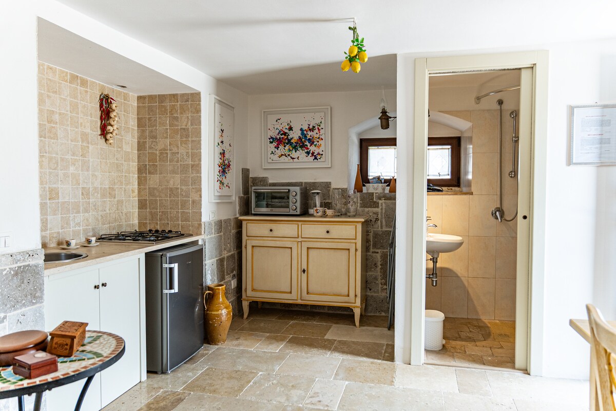 Palazzo Bergamotti è un luogo accogliente e riservato, con un ampio giardino privato, nel centro di Ostuni. L’appartamento ha una superficie di 72mq, con camera da letto, zona living con cucina, bagno e spazio all’aperto. La sala da bagno è dotata di doccia e vasca. Le volte in pietra, la luce naturale, gli arredi di design e le lenzuola in lino, creano un’atmosfera intima e autentica. Con parcheggio gratuito, è il posto ideale per chi cerca silenzio, bellezza e un ritmo un po’ più lento.