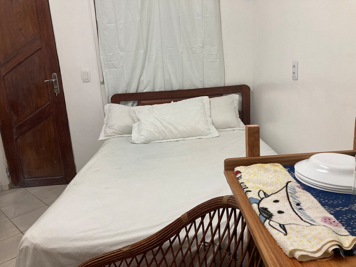 No quarto 1: cama de casal, central de ar e armador de rede. No quarto 2: duas camas de solteiro, ar condicionado, armador de rede e escrivaninha. 1 banheiro com chuveiro, vaso sanitário e pia.