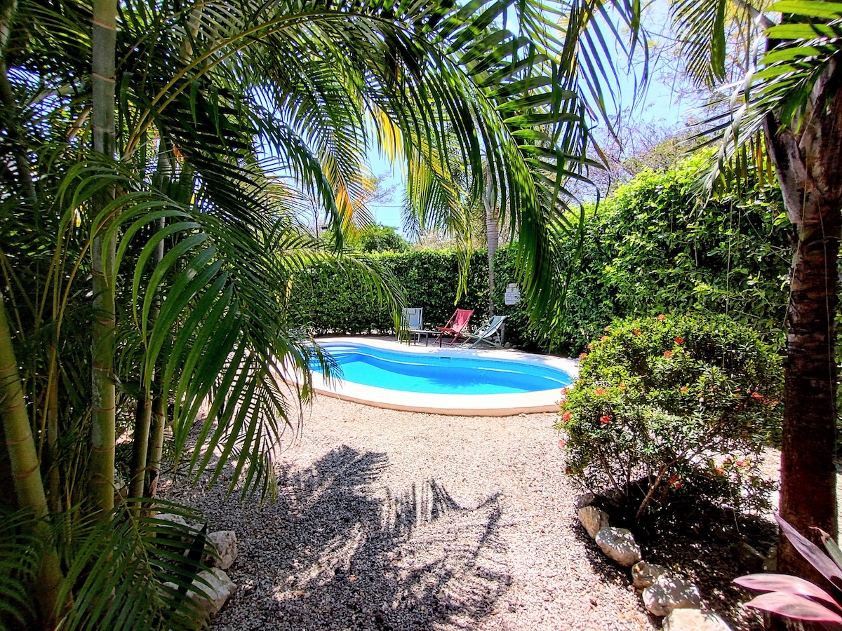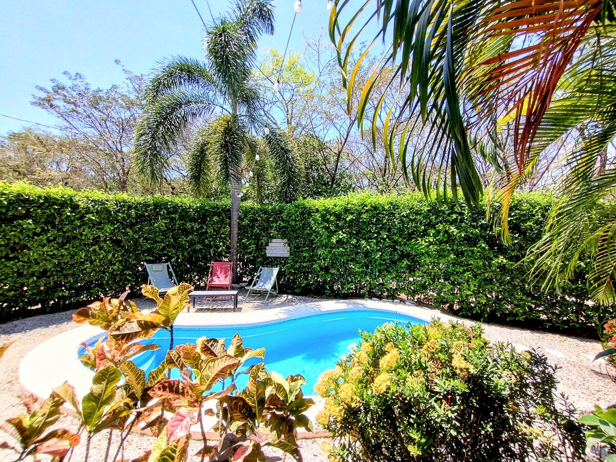 ホエザルの鳴き声に目覚め、プールと滝を眺めながら、大きな屋根付きポーチでモーニングコーヒーをお楽しみください。高級506テニスクラブ内にあるこの静かな2ベッドルーム1バスルームのヴィラは、緑豊かな熱帯の美しさ、静けさ、そして車でわずか3 ~5分、またはトゥクトゥクで素早くプラヤギオネスへアクセスできるなど、ノサラの魅力をすべて提供しています。 サーフィン、探索、またはただのんびり過ごす。ゴージャスなジャングルのような環境に囲まれたプライベートヴィラに帰ってくるのが大好きになるでしょう。
