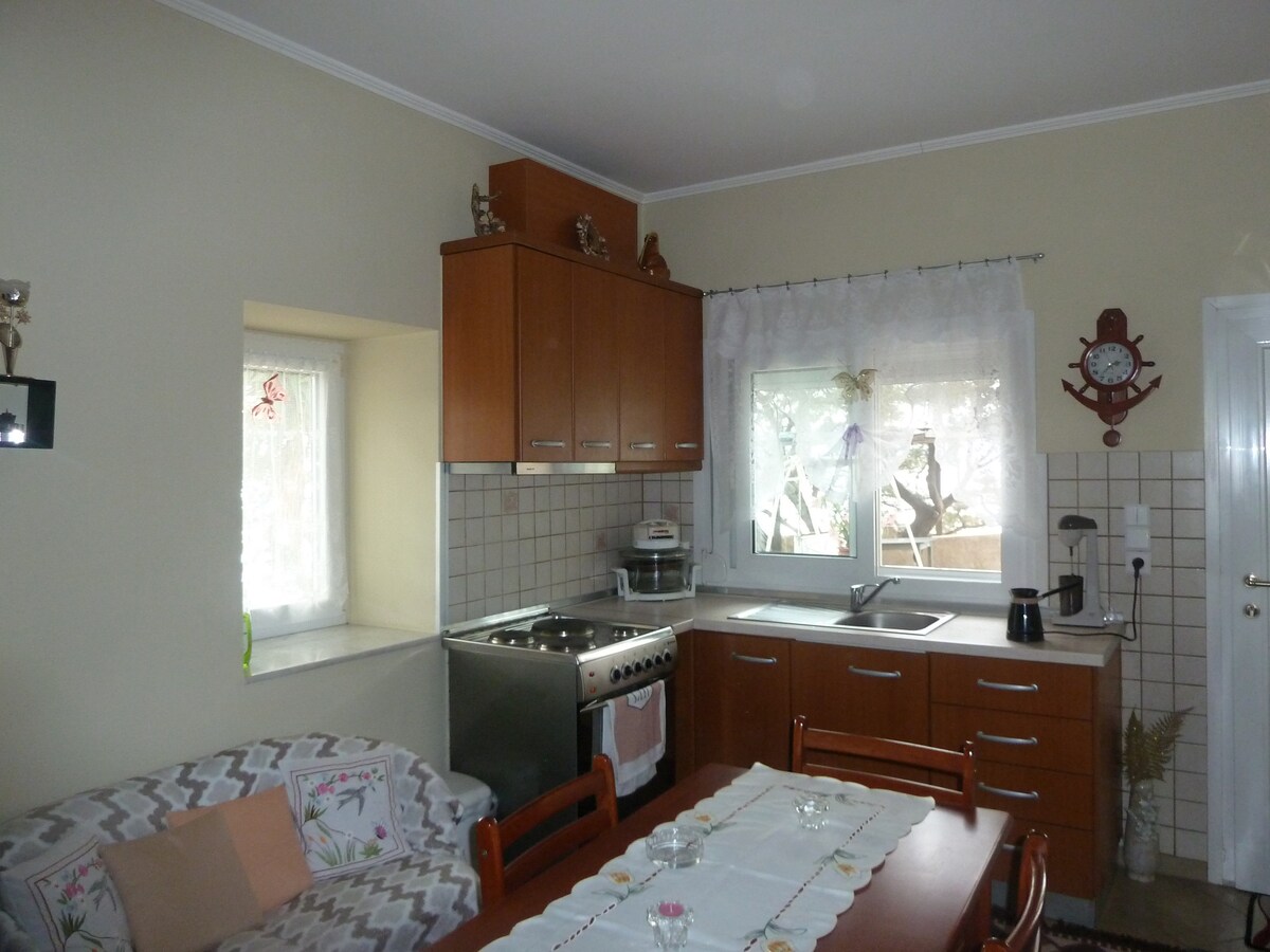 Country house where you are embraced by the green of nature, above the endless blue of the sea with a view of the sunset and leads you to 2 beaches, one big and one small beach just for you. Quiet environment away from city noises. There is a nearby restaurant (Bella Vista) with fresh fish and seafood. Marathokampos is 11 kilometers away. You can go hiking, fishing as well as discover the small beach located inside the cave.