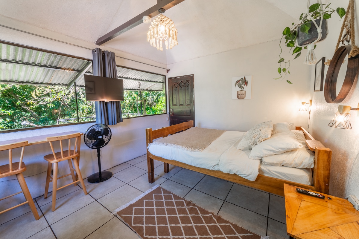 💫 ✨ This uniquely designed studio is 1 of only 7 exclusive apartments in La Fortuna, just 3 blocks from downtown yet tucked away from noisy streets. Features a kitchenette, king-size bed, A/C, fast WiFi (+200 Mbps), Smart TV, full bathroom with hot water, hairdryer & toiletries. Enjoy a private jacuzzi, free parking, and access to a stunning rooftop terrace with amazing volcano 🌋 🌴 views.
