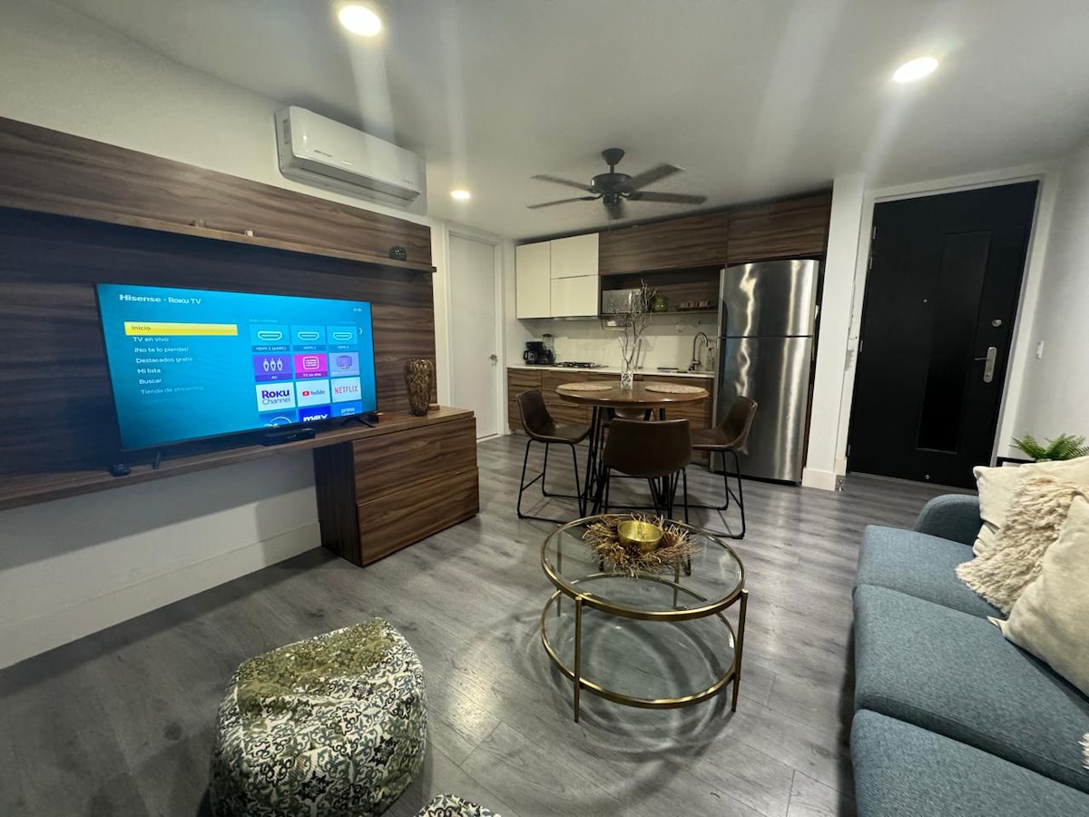 この新しく、静かで、中心部にある宿泊施設の快適さをお楽しみください。メキシコとアメリカの国境からわずか5分の絶景と絶好のロケーション。活気あふれるレボルシオン通りからわずか数ブロック。レストラン、ナイトライフ、医療機関から徒歩圏内。寝室1部屋(クイーンベッド1台+エアマットレス)、50インチテレビ1台(アプリ:HBO、Netflix、MLB)。キッチン用品、洗濯機、乾燥機、アイロン、ヘアドライヤー。24時間365日セキュリティ付き無料駐車場