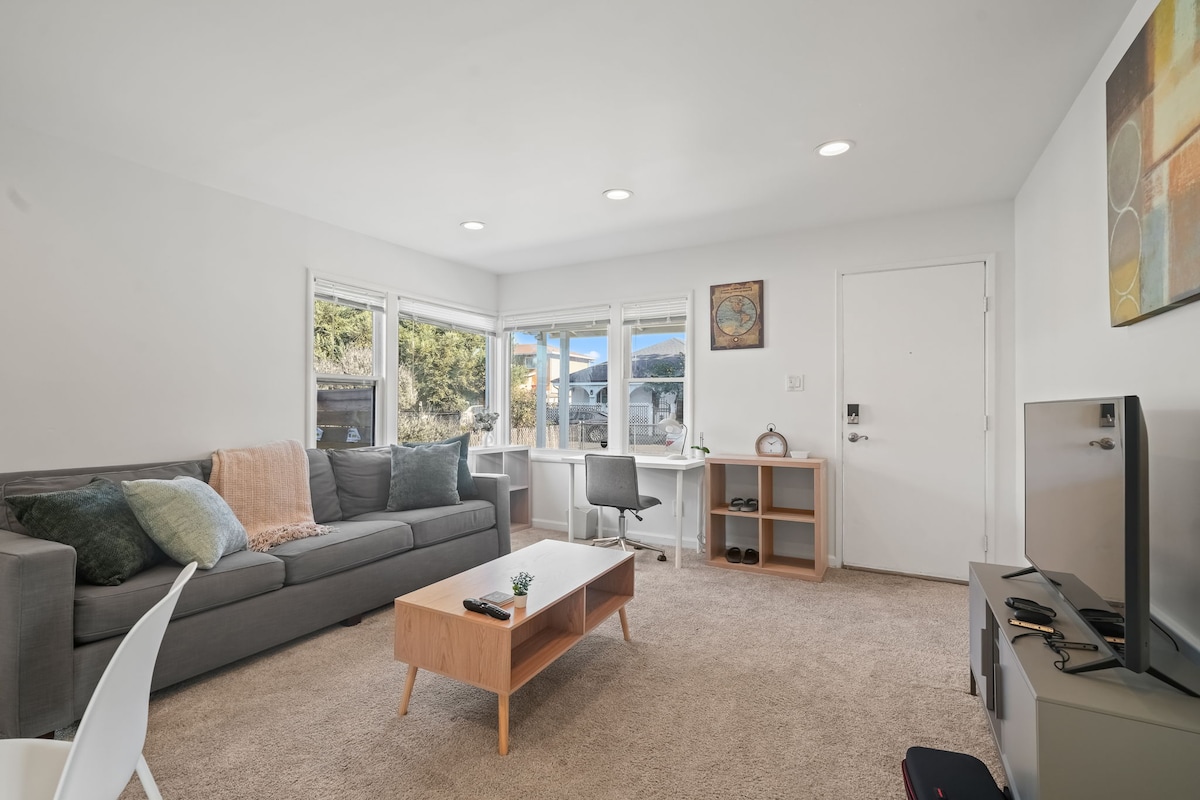 専用の入り口がある隠れ家的なガーデンスタジオへようこそ。このスタジオにはクイーンベッド1台と専用バスルームがあります。ミニ冷蔵庫、電子レンジ、トースターを備えたバーエリアがあります。フレンチドアを開けると、レッドウッドデッキと庭園、ゴールデンゲートパークとオーシャンビーチの景色が見えます。私たちはスルトロハイツにあり、フランス名誉軍団博物館、科学アカデミー博物館、デヤング美術館から数分以内です。 サポートが必要な場合は、私は上の階に住んでいます。