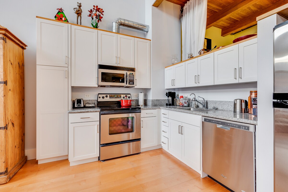…独自の空間感、スタイル、完全なプライバシーを提供します。 ゲスト用のお部屋は、1階と中二階にまたがる完全なロフト型の隠れ家として広がっています。専用の入り口があり、共有の居住スペースがないため、完全に独立した空間を提供します。 メインフロアには、フルキッチン、ダイニングエリア、温かみのある暖炉を備えたリビングルームのほか、快適さと利便性を重視して設計されたランドリールームと化粧室があります。その上のメザニンには、専用のバスルームとクローゼットを備えた主寝室があり、静かな隠れ家のような空間を提供します。