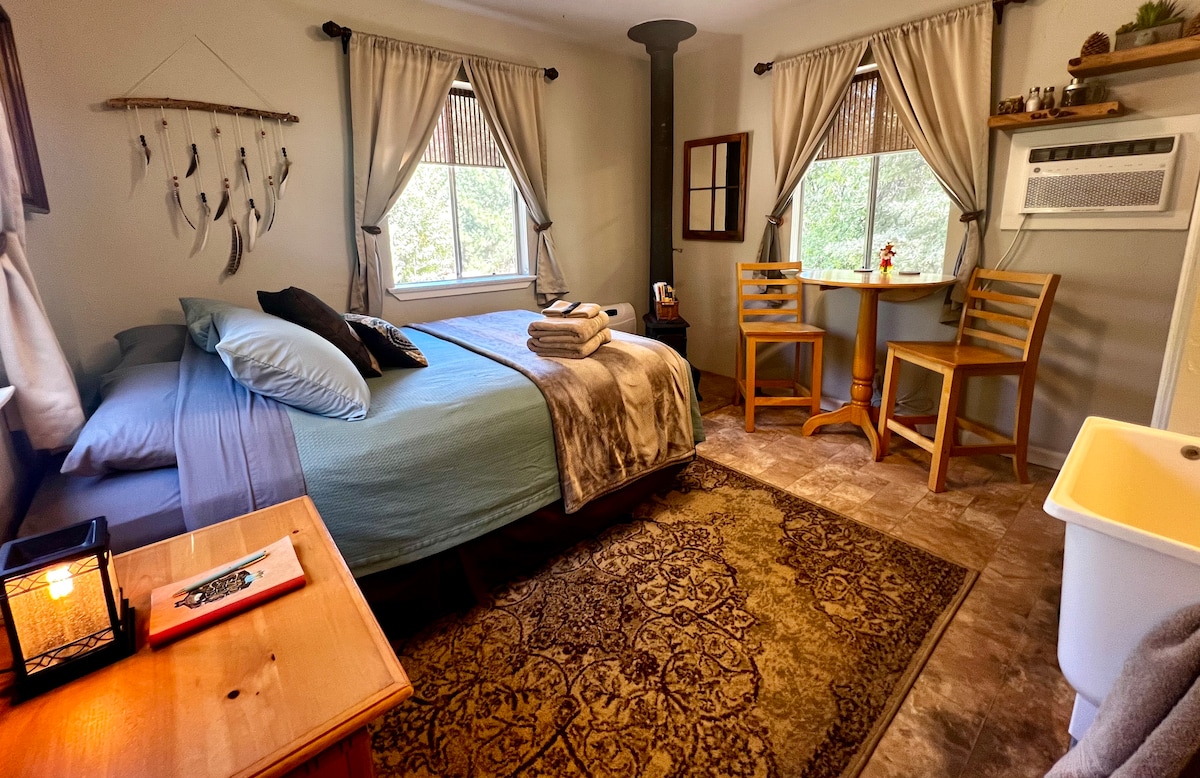 A relaxing studio a comfy full size bed we offer a twin cummfy air mattress to place in entrance area snug but cummfy fitting. a/c , heat, full bathroom with shower. Hot water is on a insta pot , not meant for long showers. microwave small fridge, hot plate, skillet coffee pot and nature's alarm rooster will crow:) kittens. not allowed in home cats are our mousers. as well as guests greeters. PLEASE add your pet if bringing one so fee will be added.