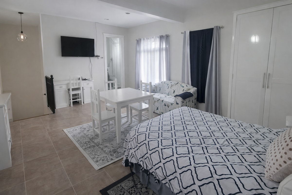 この温かいワンルームアパートメントは、素晴らしいオープンスペースです。休息と基本的なアクティビティを行うのに最適です。広い庭、独立したエントランス、車1台分のガレージ、素敵なキッチン、小さなテレビルーム、ダブルベッド2台のスペースがあります。ショッピングプラザから5分、歴史地区から20分です。